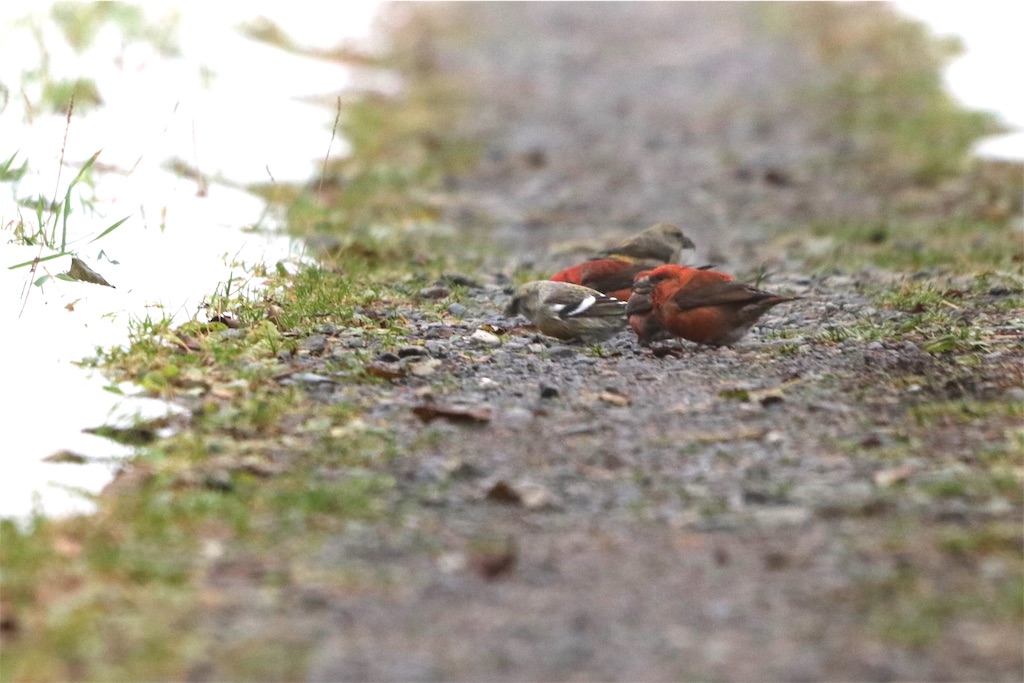2日目は冬は日の出が遅い事に定評のある北海道なので、6時20分と鳥見にしては大分遅くに始動しました。まずは海岸線を見ると前日は見かけなかったミヤマホオジロ、コホオアカが来ていました。厳島神社へ向かうとそこにもコホオアカが。次に舞浜漁港へ行くと翼を怪我していて飛べない変わりに坂道を猛ダッシュするオオセグロカモメを見かけました。ハマヒバリやコヒバリなどが居そうなロケーションなのですが、何も居ず…次に前日ベニヒワ、イスカが群れていたポイントへ行きました。昨日と変わらず大量のベニヒワ、数羽のイスカが採食していました。何か混ざっていないかなぁと1羽ずつ見ていくとベニヒワ大の大きさで翼に白斑がある見慣れない鳥が…数秒間ピンと来ませんでしたが、嘴が鍵状になっているのを見て確信しました。ナキイスカです!見つけた時が背を向けて採食していた事もあり白斑が目立ったため、印象は大分イスカと異なりました。なんとか証拠写真を撮らなければ!と思いますが、枝が入り組んだ場所にいてなかなか撮れません…そうこうしているうちにナキイスカを見失ってしまいました…必死で木を探していきますが見つからない…そして、ふと目線を下げた時に数羽の鳥達が地面で採食しているのが見えました。ツグミかなぁーと双眼鏡で確認してみるとなんとナキイスカがイスカ4羽と採食しているではありませんかΣ(゚д゚;)急いで、且つ飛ばさないように写真を撮りましたが数枚撮った所で少し奥へ飛ばれてしまい、そーっと近づこうとした所で奥のツグミ類もろとも飛ばれてしまいました。次のターゲットはガイドのKさんに教えて頂いたコバシギンザンマシコ(ギンザンマシコの亜種)です。ここ数日はノゴマ館付近でナナカマドを食べていたという事で念入りに探しましたが見つかりません…島中にナナカマドがあるので場所を変えてしまったのでしょう…(後にナキイスカを見たポイントに移動していたと伺いました)