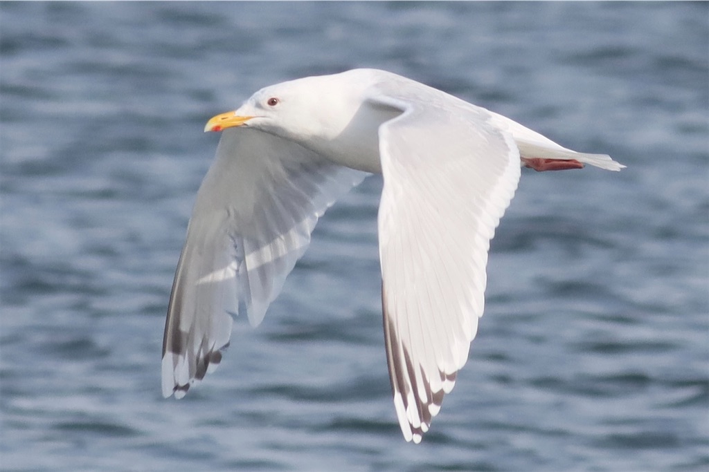 こちらも上の成鳥と同じ日に見つかった。こちらは午後の最も風が強い時間帯に西部川河口をオオセグロ100羽ほどに混ざり飛んでいた。コントラストが強く尾羽の黒帯が狭く、モンゴルの特徴がよく分かる個体だった。